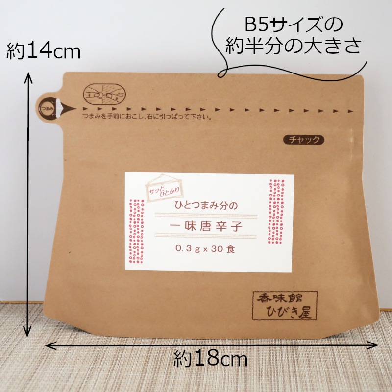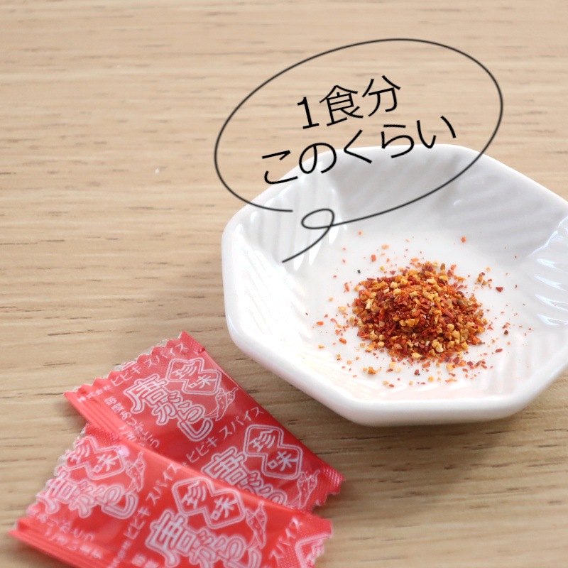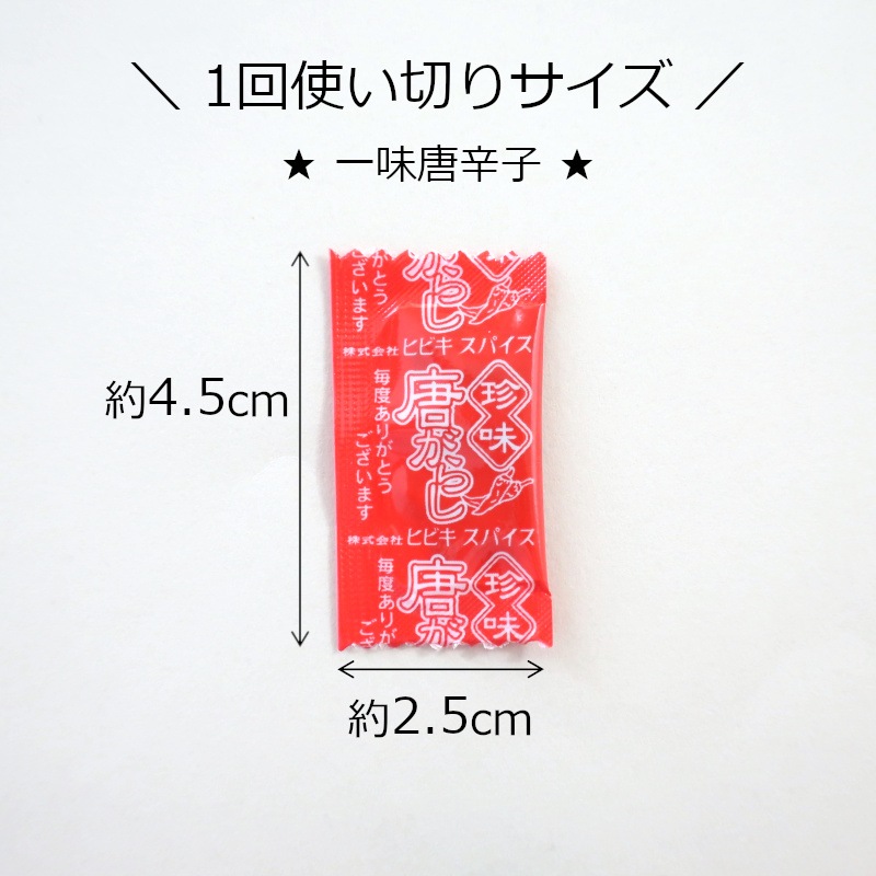 1食分のうどんやそばにちょうど良い量です。唐辛子の1回の使用量は少ないので、特に1人暮らしや少人数家族にとっては、余らせてしまいがちなスパイスですが、1回使い切りサイズだと使う直前に開封、いつも新鮮スパイスを味わえますよ!